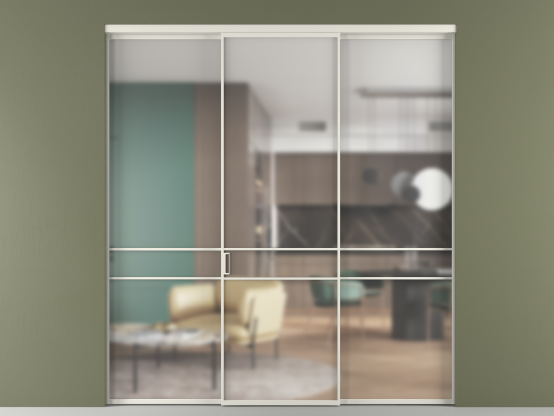 Во всех алюминиевых перегородках, независимо от типа установки, используется компланарный раздвижной механизм, благодаря которому декоративная крышка и полотно находятся в одной плоскости.