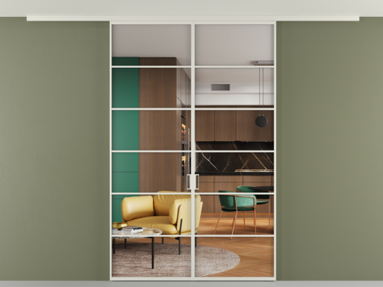 Алюминиевые перегородки имеют единый профиль с алюминиевыми дверьми и легко сочетаются в одном пространстве, не перегружая его. Также их можно комбинировать в интерьере с полотнами из нашего стандартного ассортимента. Помимо этого, система алюминиевых перегородок и дверей координируется со стеновыми панелями Волховец.
