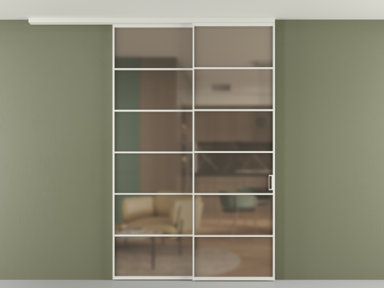Во всех алюминиевых перегородках, независимо от типа установки, используется компланарный раздвижной механизм, благодаря которому декоративная крышка и полотно находятся в одной плоскости.