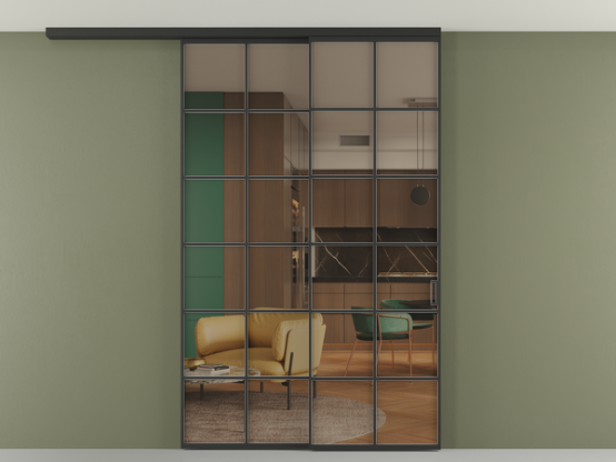 Во всех алюминиевых перегородках, независимо от типа установки, используется компланарный раздвижной механизм, благодаря которому декоративная крышка и полотно находятся в одной плоскости.