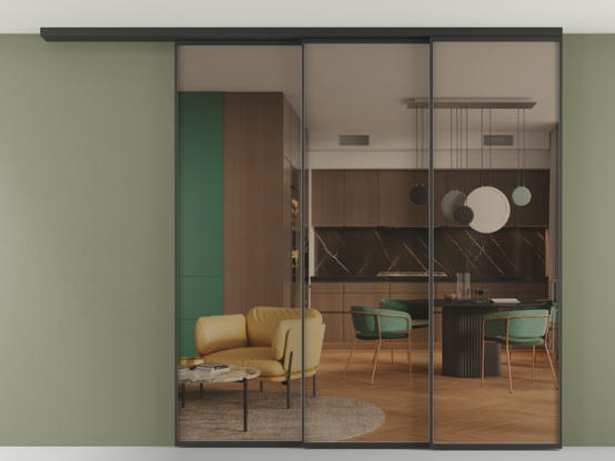 Во всех алюминиевых перегородках, независимо от типа установки, используется компланарный раздвижной механизм, благодаря которому декоративная крышка и полотно находятся в одной плоскости.