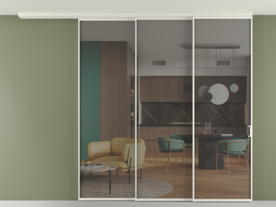 Во всех алюминиевых перегородках, независимо от типа установки, используется компланарный раздвижной механизм, благодаря которому декоративная крышка и полотно находятся в одной плоскости.