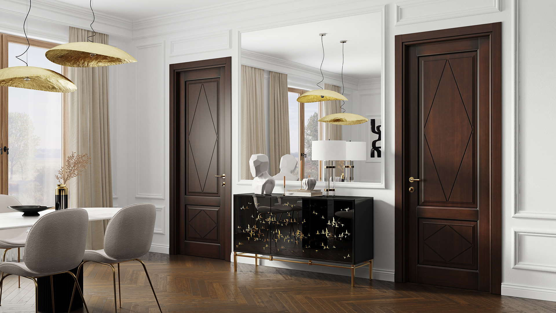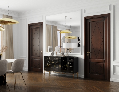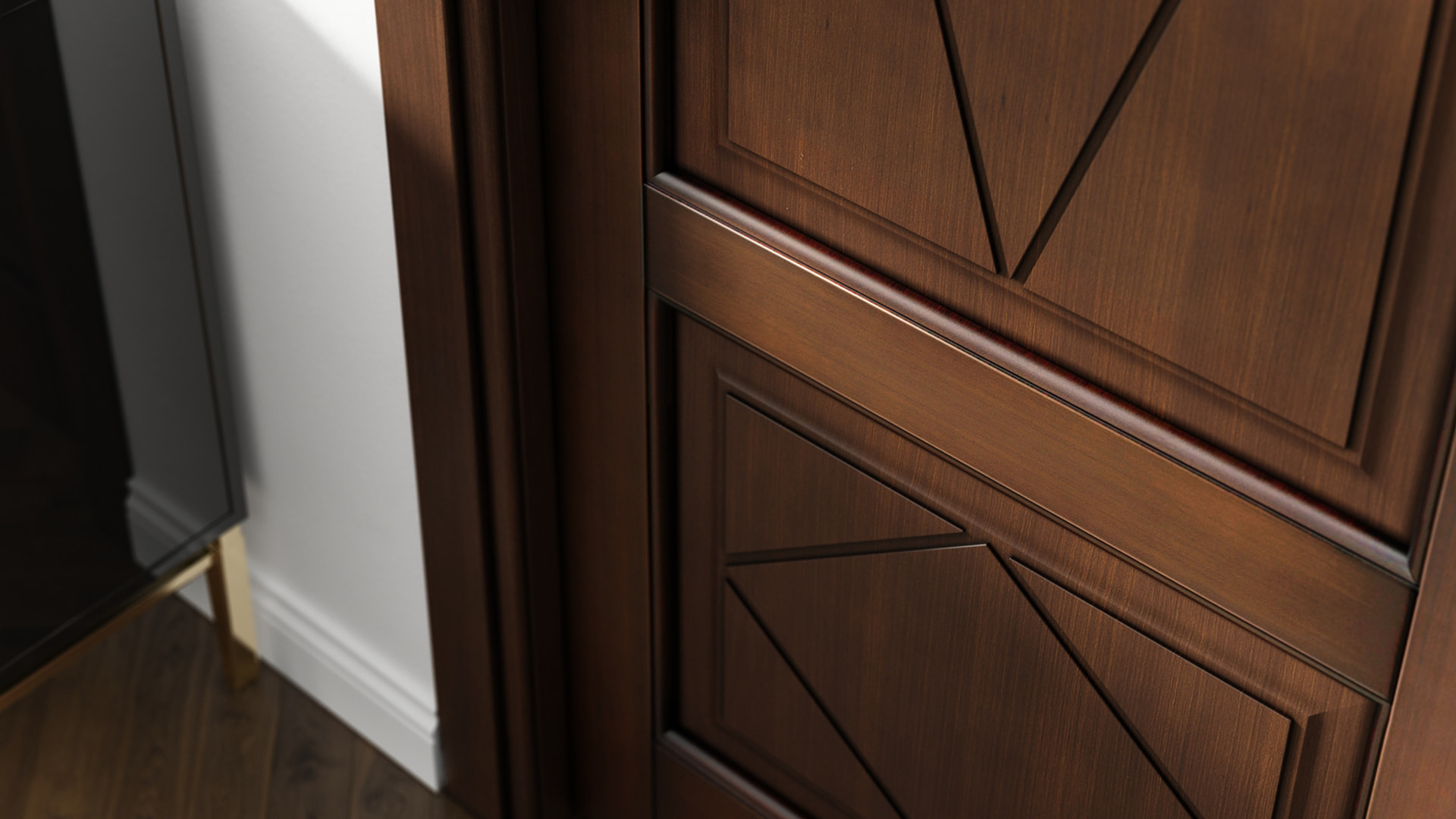 В этой коллекции на филёнках вручную создается геометрический узор. Также для дополнения образа резьба повторяется на капителе.