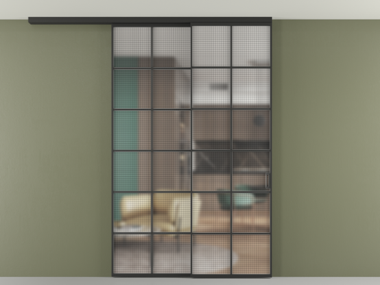 Во всех алюминиевых перегородках, независимо от типа установки, используется компланарный раздвижной механизм, благодаря которому декоративная крышка и полотно находятся в одной плоскости.
