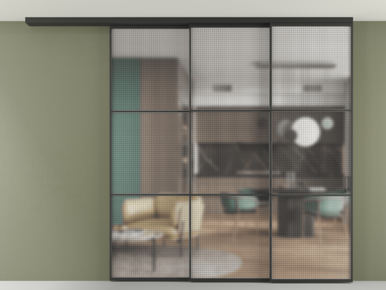Дополнительно на раздвижную двустворчатую перегородку вдоль стены и четырёхстворчатую перегородку внутри проёма с двумя неподвижным полотнами можно установить механизм синхронного открывания — при открывании одной створки, вторая открывается автоматически.