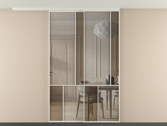 Во всех алюминиевых перегородках, независимо от типа установки, используется компланарный раздвижной механизм, благодаря которому декоративная крышка и полотно находятся в одной плоскости.
