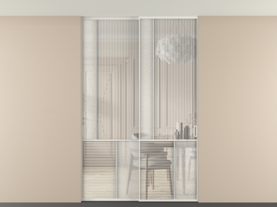 Во всех алюминиевых перегородках, независимо от типа установки, используется компланарный раздвижной механизм, благодаря которому декоративная крышка и полотно находятся в одной плоскости.