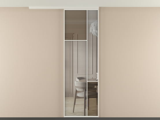 Во всех алюминиевых перегородках, независимо от типа установки, используется компланарный раздвижной механизм, благодаря которому декоративная крышка и полотно находятся в одной плоскости.