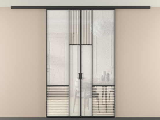 Во всех алюминиевых перегородках, независимо от типа установки, используется компланарный раздвижной механизм, благодаря которому декоративная крышка и полотно находятся в одной плоскости.