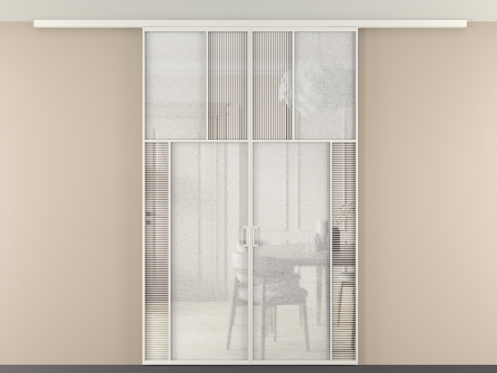 Дополнительно на раздвижную двустворчатую перегородку вдоль стены и четырехстворчатую перегородку внутри проема с двумя неподвижным полотнами можно установить механизм синхронного открывания — при открывании одной створки, вторая открывается автоматически.