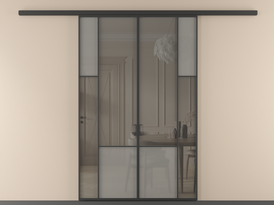 Во всех алюминиевых перегородках, независимо от типа установки, используется компланарный раздвижной механизм, благодаря которому декоративная крышка и полотно находятся в одной плоскости.