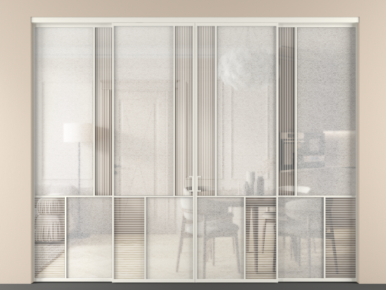 Дополнительно на раздвижную двустворчатую перегородку вдоль стены и четырехстворчатую перегородку внутри проема с двумя неподвижным полотнами можно установить механизм синхронного открывания — при открывании одной створки, вторая открывается автоматически.