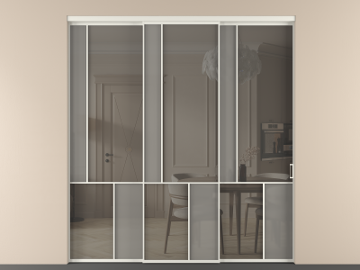 Дополнительно на раздвижную двустворчатую перегородку вдоль стены и четырехстворчатую перегородку внутри проема с двумя неподвижным полотнами можно установить механизм синхронного открывания — при открывании одной створки, вторая открывается автоматически.