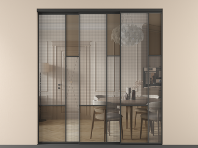 Во всех алюминиевых перегородках, независимо от типа установки, используется компланарный раздвижной механизм, благодаря которому декоративная крышка и полотно находятся в одной плоскости.