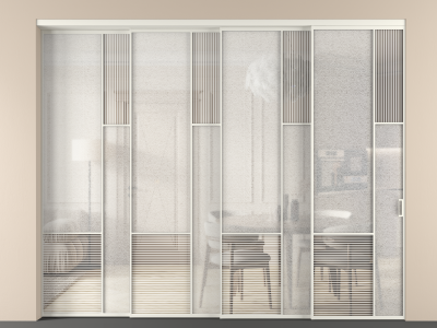 Во всех алюминиевых перегородках, независимо от типа установки, используется компланарный раздвижной механизм, благодаря которому декоративная крышка и полотно находятся в одной плоскости.