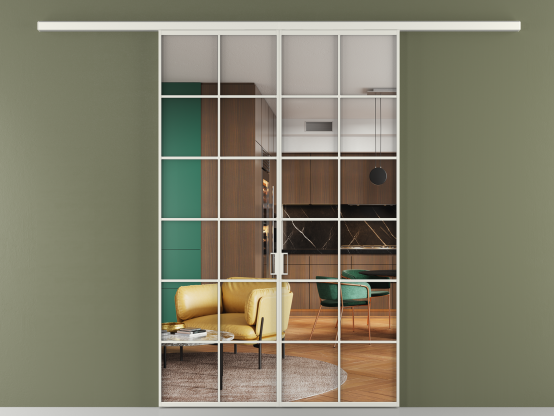 Во всех алюминиевых перегородках, независимо от типа установки, используется компланарный раздвижной механизм, благодаря которому декоративная крышка и полотно находятся в одной плоскости.