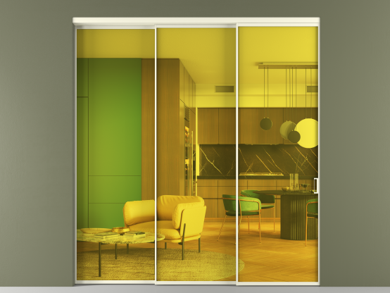 Мы предлагаем девять вариантов декоративного стекла: от кристально-прозрачного до матовых цветных, а также стёкла с эффектом Stopsol, когда лицевая сторона стекла зеркальная, но при включенном освещении за стеклом — становится прозрачной.