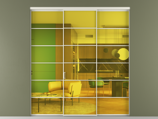 Мы предлагаем девять вариантов декоративного стекла: от кристально-прозрачного до матовых цветных, а также стёкла с эффектом Stopsol, когда лицевая сторона стекла зеркальная, но при включенном освещении за стеклом — становится прозрачной.