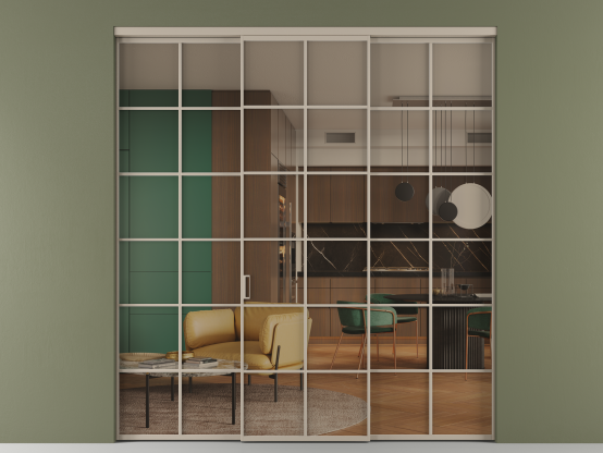 Алюминиевые перегородки имеют единый профиль с алюминиевыми дверьми и легко сочетаются в одном пространстве, не перегружая его. Также их можно комбинировать в интерьере с полотнами из нашего стандартного ассортимента. Помимо этого, система алюминиевых перегородок и дверей координируется со стеновыми панелями Волховец.