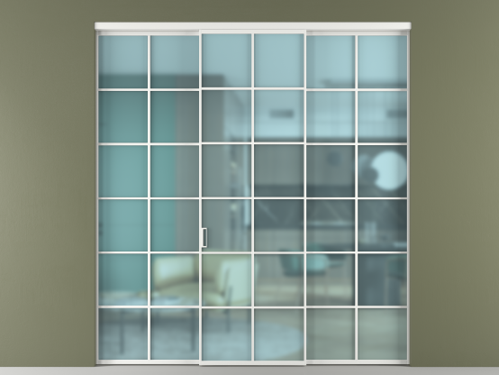 Дополнительно на раздвижную двустворчатую перегородку вдоль стены и четырёхстворчатую перегородку внутри проёма с двумя неподвижным полотнами можно установить механизм синхронного открывания — при открывании одной створки, вторая открывается автоматически.