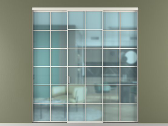Дополнительно на раздвижную двустворчатую перегородку вдоль стены и четырёхстворчатую перегородку внутри проёма с двумя неподвижным полотнами можно установить механизм синхронного открывания — при открывании одной створки, вторая открывается автоматически.