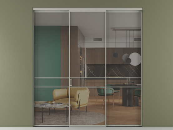 Во всех алюминиевых перегородках, независимо от типа установки, используется компланарный раздвижной механизм, благодаря которому декоративная крышка и полотно находятся в одной плоскости.