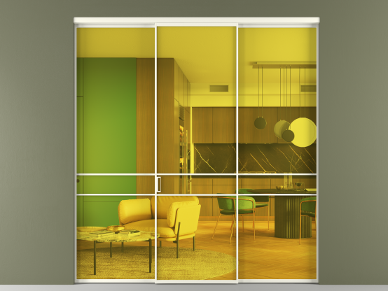 Мы предлагаем девять вариантов декоративного стекла: от кристально-прозрачного до матовых цветных, а также стёкла с эффектом Stopsol, когда лицевая сторона стекла зеркальная, но при включенном освещении за стеклом — становится прозрачной.
