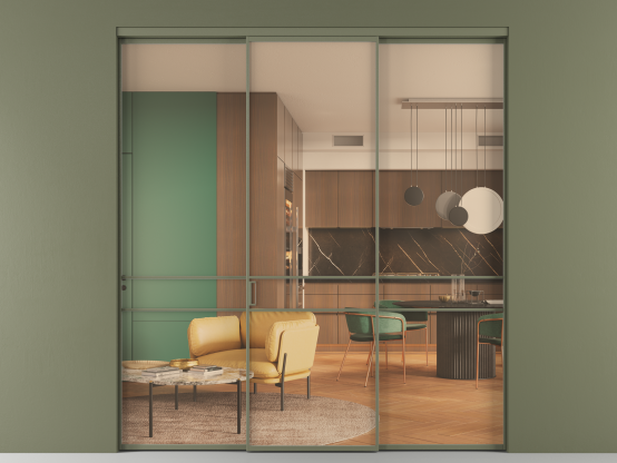Алюминиевые перегородки имеют единый профиль с алюминиевыми дверьми и легко сочетаются в одном пространстве, не перегружая его. Также их можно комбинировать в интерьере с полотнами из нашего стандартного ассортимента. Помимо этого, система алюминиевых перегородок и дверей координируется со стеновыми панелями Волховец.