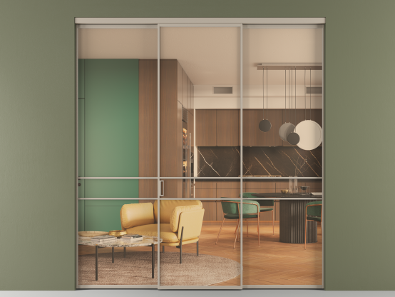 Алюминиевые перегородки имеют единый профиль с алюминиевыми дверьми и легко сочетаются в одном пространстве, не перегружая его. Также их можно комбинировать в интерьере с полотнами из нашего стандартного ассортимента. Помимо этого, система алюминиевых перегородок и дверей координируется со стеновыми панелями Волховец.