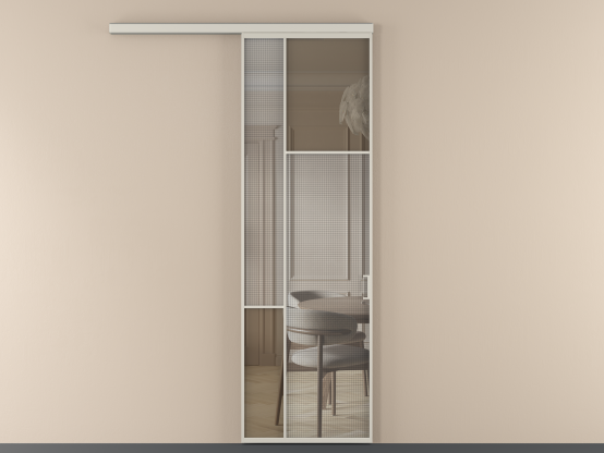 Во всех алюминиевых перегородках, независимо от типа установки, используется компланарный раздвижной механизм, благодаря которому декоративная крышка и полотно находятся в одной плоскости.