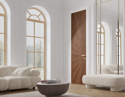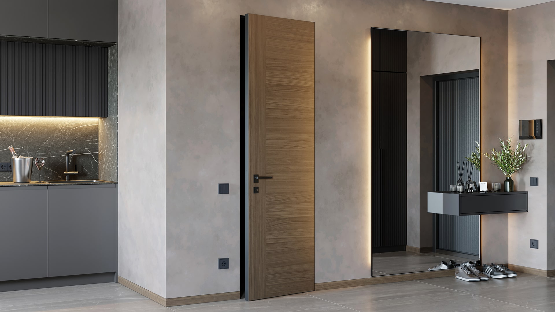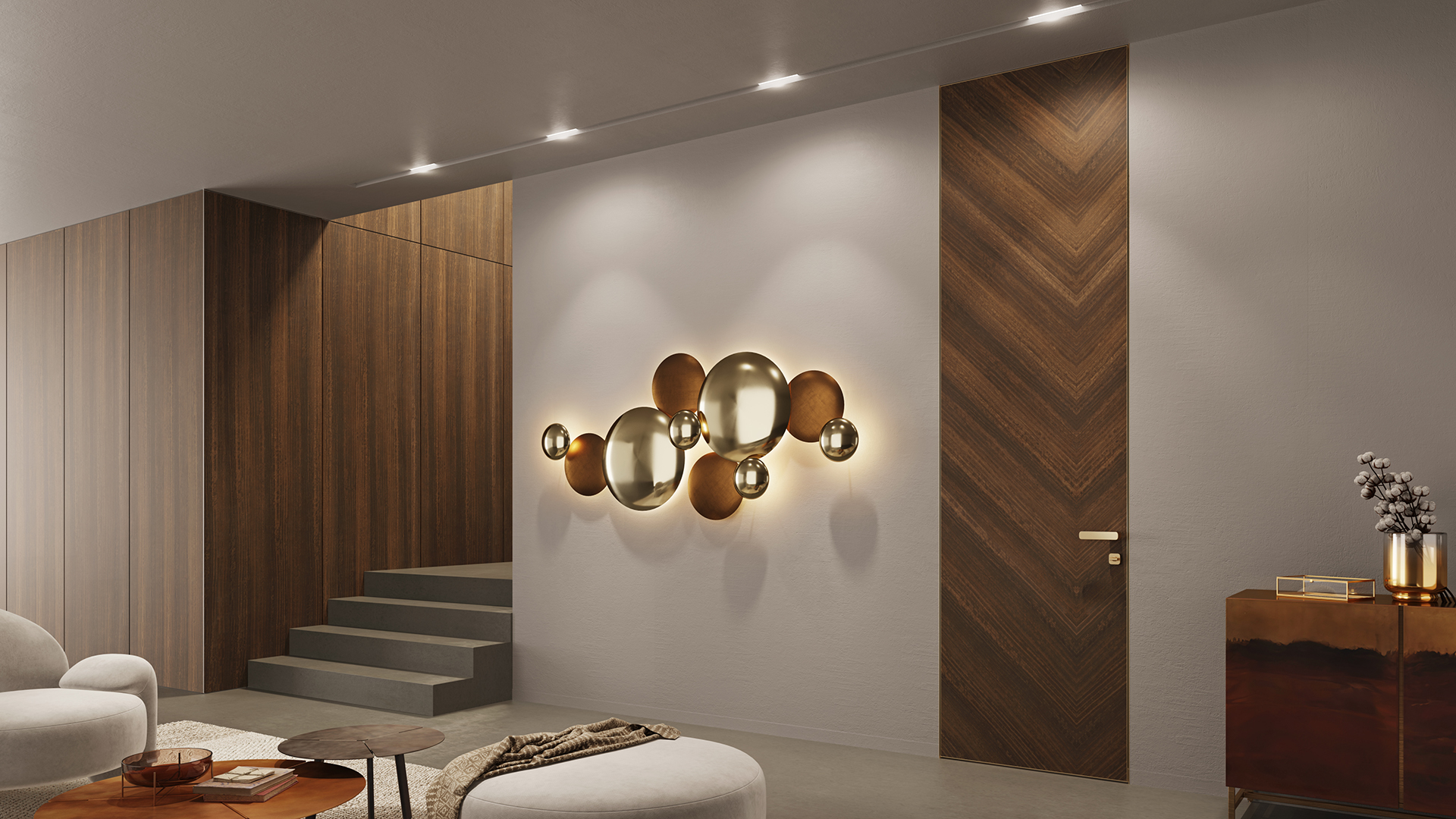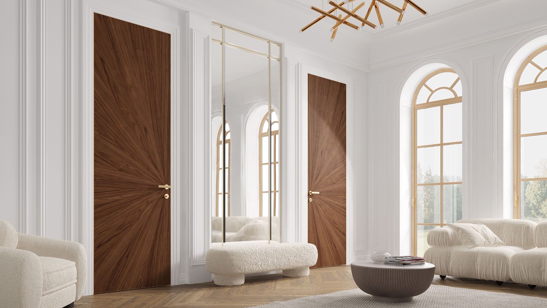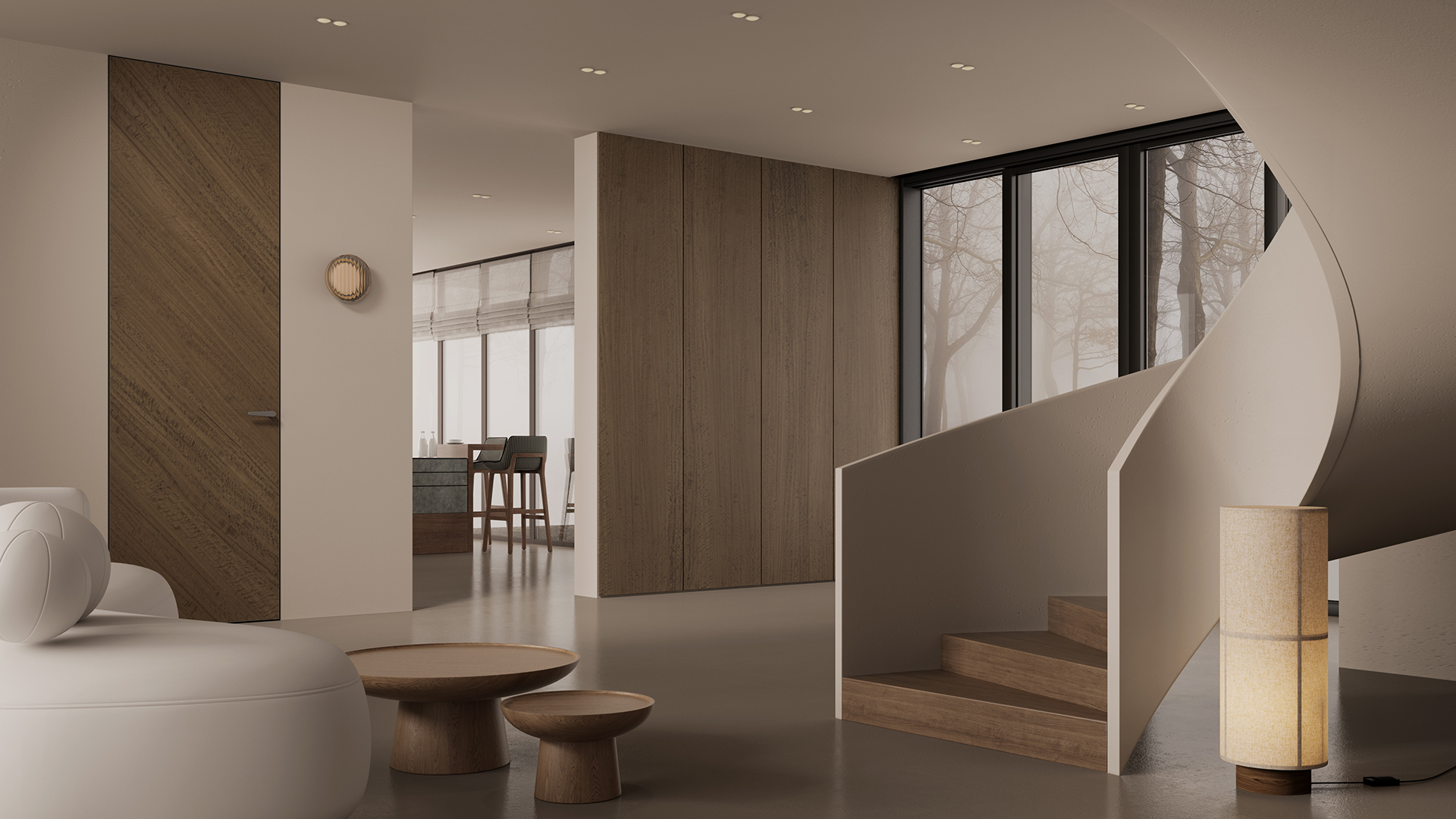 Полотно Rift в скрытом алюминиевом коробе становится полноценным элементом декора. В коллекции представлено 9 моделей дверей в высоте до 3 метров. Рисунок раскладки шпона варьируется от простого до сложного. «Рубашка» для каждого полотна подбирается вручную по цвету, текстуре и фактуре.