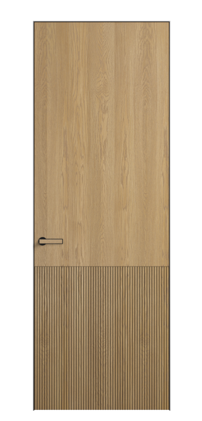 Это полотна с рельефной фрезеровкой. Этот прием делает интерьер объемным, тактильным, вносит интересную текстуру и создает современный образ. Волнистый рельеф может быть выполнен по ламелям из массива дуба в древесных матовых отделках, либо исполнен по натуральному и экологически безопасному материалу — ХДФ, покрытому гладкой эмалью актуальных оттенков.