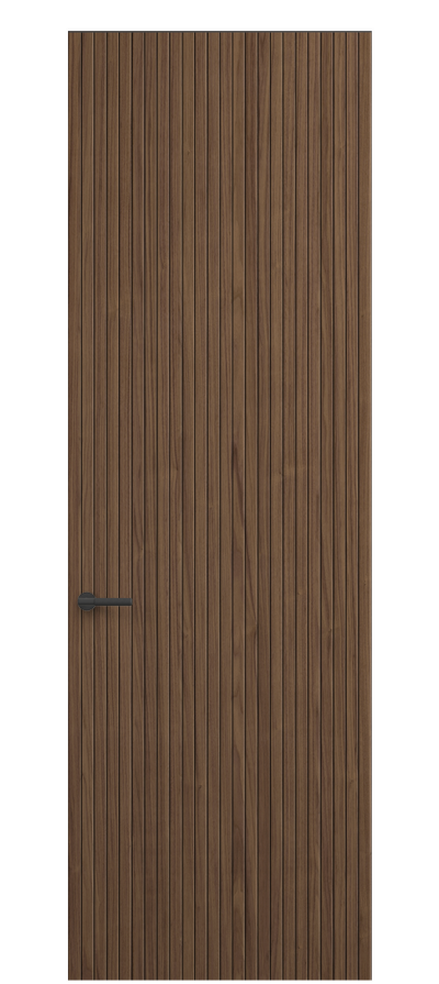 SELECT — коллекция минималистичных дверей с фрезеровкой по натуральному шпону. Рельеф на поверхности полотна создаёт игру света и тени, добавляя пространству динамичности и визуального объёма. Двери SELECT в сочетании со стеновыми панелями и мебельными фасадами, повторяющими лаконичный дизайн, создают единое стилевое решение.