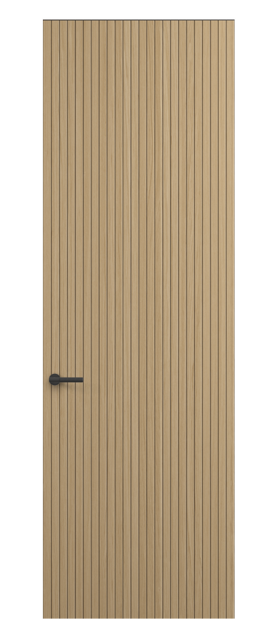 SELECT — коллекция минималистичных дверей с фрезеровкой по натуральному шпону. Рельеф на поверхности полотна создаёт игру света и тени, добавляя пространству динамичности и визуального объёма. Двери SELECT в сочетании со стеновыми панелями и мебельными фасадами, повторяющими лаконичный дизайн, создают единое стилевое решение.