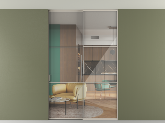 Алюминиевые перегородки имеют единый профиль с алюминиевыми дверьми и легко сочетаются в одном пространстве, не перегружая его. Также их можно комбинировать в интерьере с полотнами из нашего стандартного ассортимента. Помимо этого, система алюминиевых перегородок и дверей координируется со стеновыми панелями Волховец.