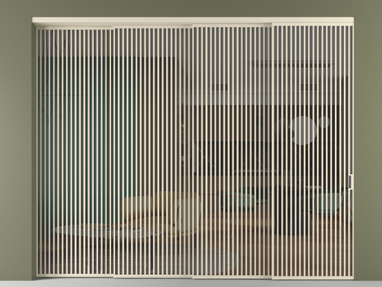 Дополнительно на раздвижную двустворчатую перегородку вдоль стены и четырёхстворчатую перегородку внутри проёма с двумя неподвижным полотнами можно установить механизм синхронного открывания — при открывании одной створки, вторая открывается автоматически.