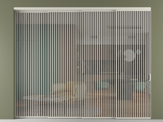 Дополнительно на раздвижную двустворчатую перегородку вдоль стены и четырёхстворчатую перегородку внутри проёма с двумя неподвижным полотнами можно установить механизм синхронного открывания — при открывании одной створки, вторая открывается автоматически.