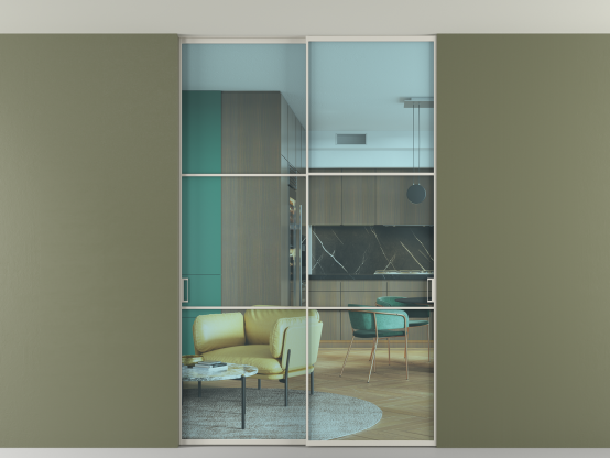 Алюминиевые перегородки имеют единый профиль с алюминиевыми дверьми и легко сочетаются в одном пространстве, не перегружая его. Также их можно комбинировать в интерьере с полотнами из нашего стандартного ассортимента. Помимо этого, система алюминиевых перегородок и дверей координируется со стеновыми панелями Волховец.