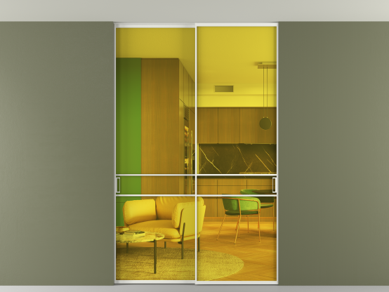 Мы предлагаем девять вариантов декоративного стекла: от кристально-прозрачного до матовых цветных, а также стёкла с эффектом Stopsol, когда лицевая сторона стекла зеркальная, но при включенном освещении за стеклом — становится прозрачной.