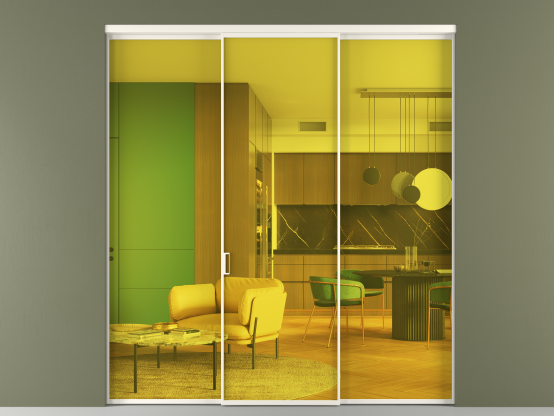 Мы предлагаем девять вариантов декоративного стекла: от кристально-прозрачного до матовых цветных, а также стёкла с эффектом Stopsol, когда лицевая сторона стекла зеркальная, но при включенном освещении за стеклом — становится прозрачной.