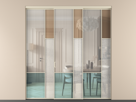 Дополнительно на раздвижную двустворчатую перегородку вдоль стены и четырехстворчатую перегородку внутри проема с двумя неподвижным полотнами можно установить механизм синхронного открывания — при открывании одной створки, вторая открывается автоматически.