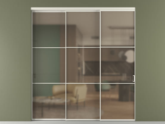 Во всех алюминиевых перегородках, независимо от типа установки, используется компланарный раздвижной механизм, благодаря которому декоративная крышка и полотно находятся в одной плоскости.