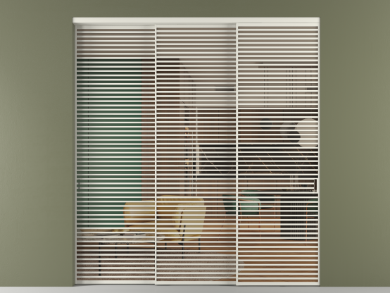 Дополнительно на раздвижную двустворчатую перегородку вдоль стены и четырёхстворчатую перегородку внутри проёма с двумя неподвижным полотнами можно установить механизм синхронного открывания — при открывании одной створки, вторая открывается автоматически.