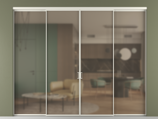 Во всех алюминиевых перегородках, независимо от типа установки, используется компланарный раздвижной механизм, благодаря которому декоративная крышка и полотно находятся в одной плоскости.