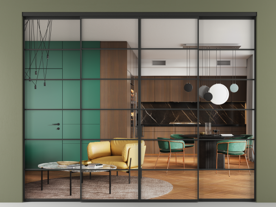 Перегородки FORMATO сочетаются с алюминиевыми дверьми FORMATO, стеновыми панелями Волховец и коллекциями межкомнатных дверей PLANUM PRO, VELVET.