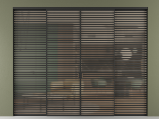 Дополнительно на раздвижную двустворчатую перегородку вдоль стены и четырёхстворчатую перегородку внутри проёма с двумя неподвижным полотнами можно установить механизм синхронного открывания — при открывании одной створки, вторая открывается автоматически.