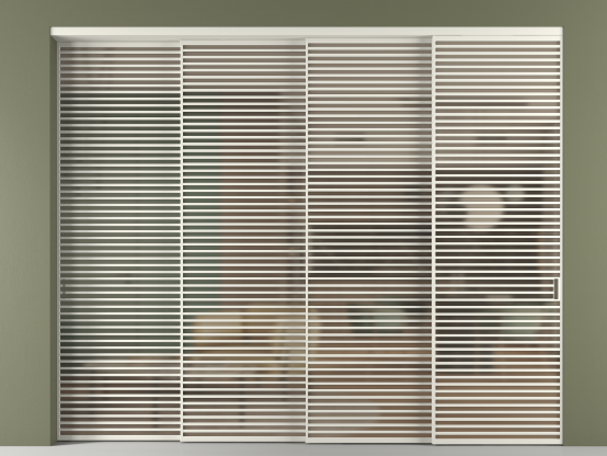 Дополнительно на раздвижную двустворчатую перегородку вдоль стены и четырёхстворчатую перегородку внутри проёма с двумя неподвижным полотнами можно установить механизм синхронного открывания — при открывании одной створки, вторая открывается автоматически.