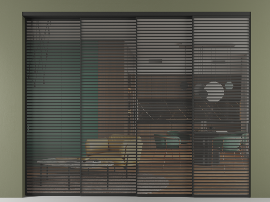 Во всех алюминиевых перегородках, независимо от типа установки, используется компланарный раздвижной механизм, благодаря которому декоративная крышка и полотно находятся в одной плоскости.