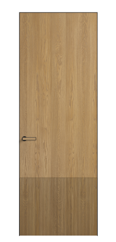 Это полотна с рельефной фрезеровкой. Этот прием делает интерьер объемным, тактильным, вносит интересную текстуру и создает современный образ. Волнистый рельеф может быть выполнен по ламелям из массива дуба в древесных матовых отделках, либо исполнен по натуральному и экологически безопасному материалу — ХДФ, покрытому гладкой эмалью актуальных оттенков.
