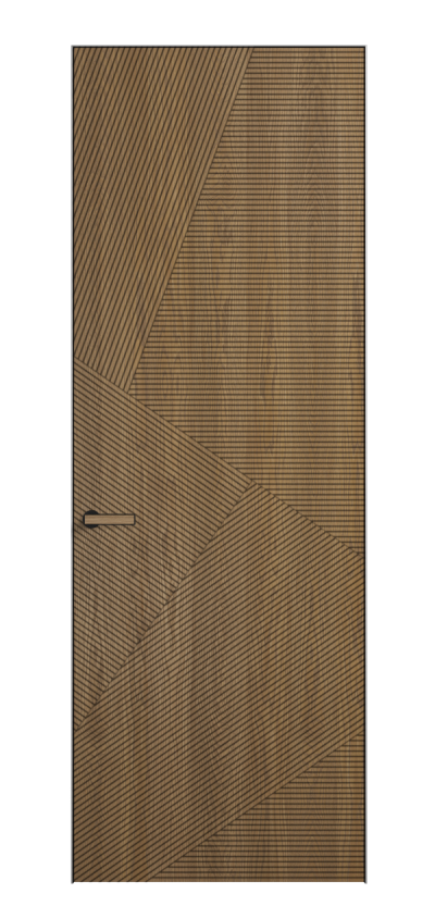 Это полотна с рельефной фрезеровкой. Этот прием делает интерьер объемным, тактильным, вносит интересную текстуру и создает современный образ. Волнистый рельеф может быть выполнен по ламелям из массива дуба в древесных матовых отделках, либо исполнен по натуральному и экологически безопасному материалу — ХДФ, покрытому гладкой эмалью актуальных оттенков.